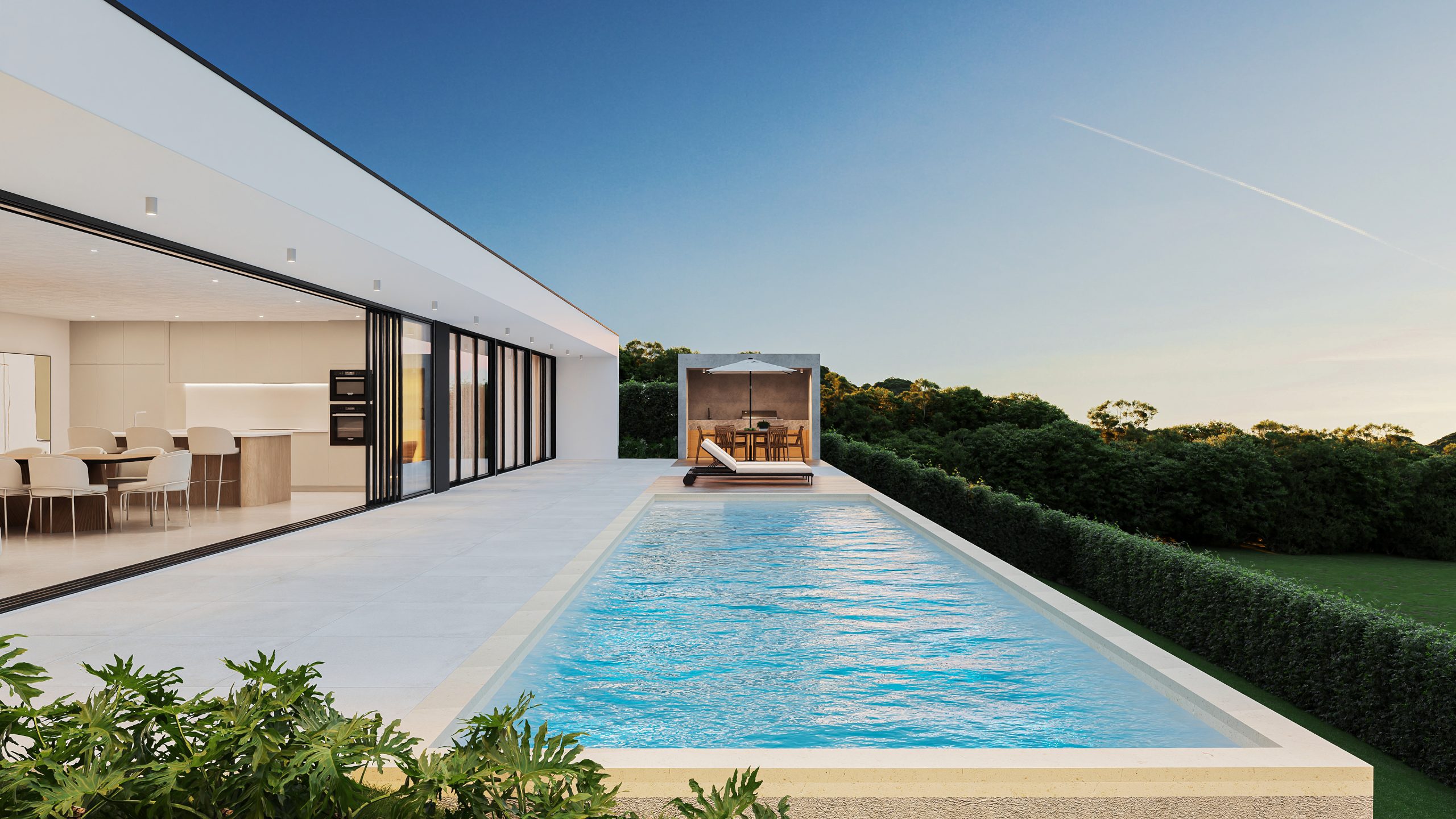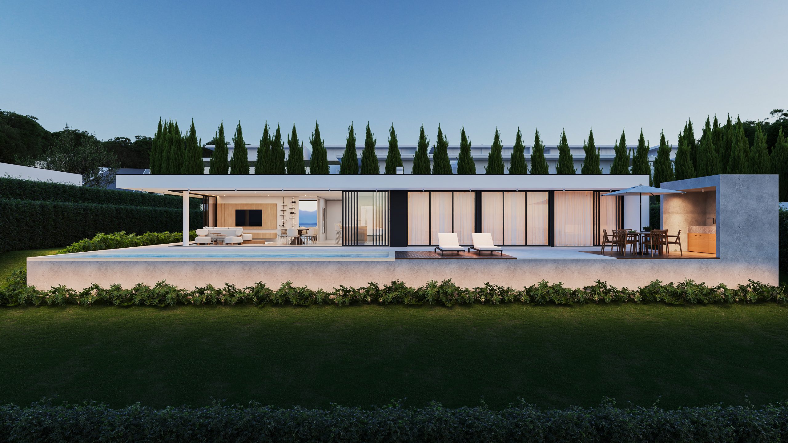 No exterior, cada unidade conta com piscina privativa, espaços de lazer integrados no lote e garagem para dois carros, garantindo comodidade e valorização patrimonial.